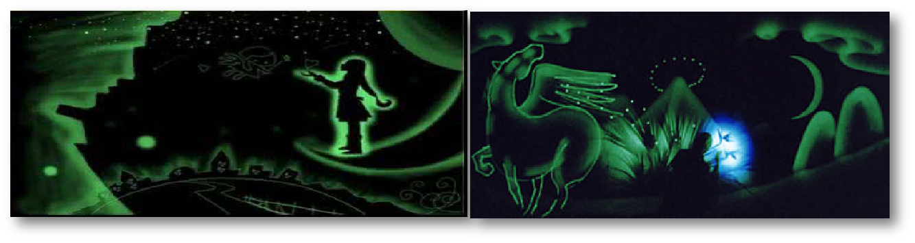 光影畫,是指用光來畫畫。光影畫是一種最新的演出形式,效果唯美,給人營造出夢幻般的絢麗畫面。光影畫的背景是一塊綠色留光型螢光板,畫者手中的是一支LED高亮小型手電筒。螢光板被照射後由於光強的差別會有不同的留光亮度和留光時間。所以畫者可以通過手電筒的遠近、手掌的對光的遮擋,手電筒的方向來營造夢幻的感覺。同時由於螢光板的留光時間不會很長,所以畫出來的畫就會自動慢慢淡去。
